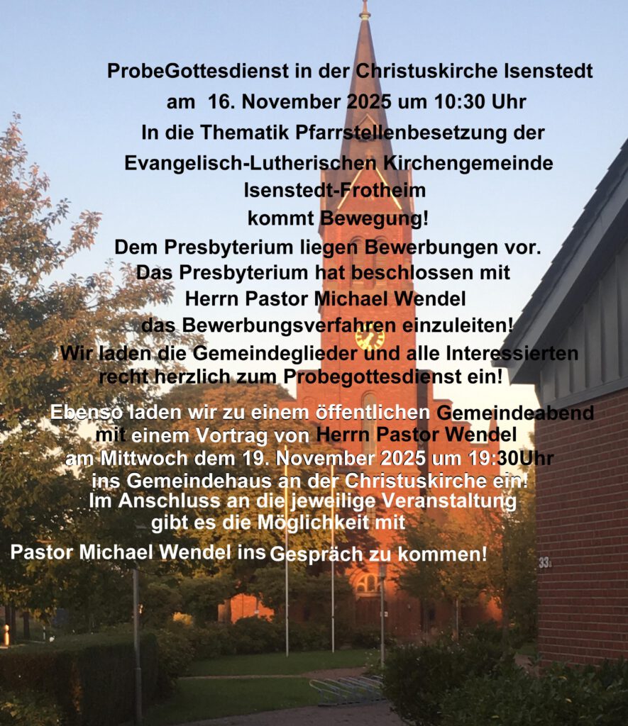 Wir laden die Gemeindeglieder und alle Interessierten recht herzlich zum Probegottesdienst ein am Sonntag dem 16. November 2025 um 10:30 Uhr in die Christuskirche in Isenstedt ein!